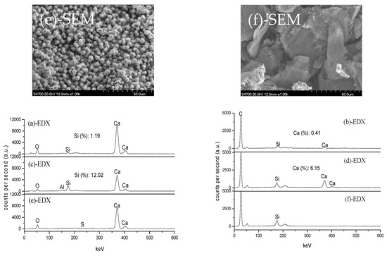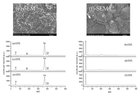 SEM+EDX analyses: (a) CaO (1500 °C); (b) pure-C (1500 °C); (c) CaO (+pure-C, 1500 °C); (d) pure-C (+CaO, 1500 °C); (e) CaO (+pure-C, 1700 °C); (f) pure-C (+CaO, 1700 °C).