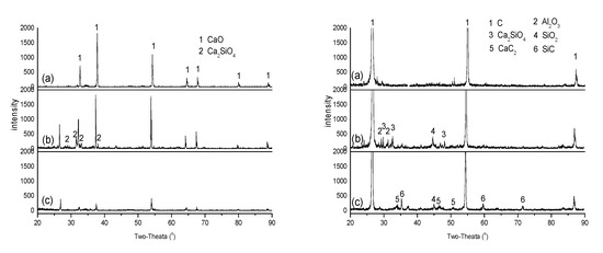 XRD analyses: (a) CaO (left) and ash-C (right) alone at 1500 °C; (b) CaO (left) and ash-C (right) when they were in close contact at 1500 °C; (c) CaO (left) and ash-C (right) when they were in close contact at 1700 °C.