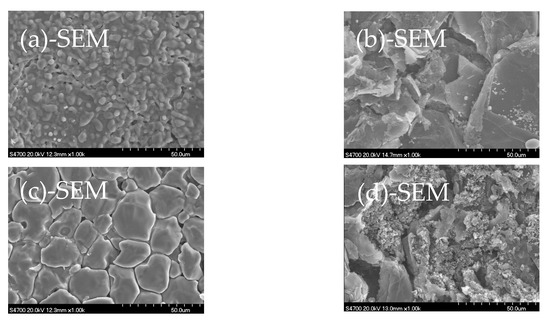Figure 4 shows SEM+EDX results of the samples analyzed in Figure 3. Clearly, the morphology of the closely contacted CaO and ash-C tablets is different from that when heated alone. The contact of ash-C tablet makes the surface of CaO tablet melt at 1500 °C and form spherical granules of about 5 µm in diameter at 1700 °C. This is accompanied by an increase in Si content at 1500 °C (12.02%) and the disappearance of Si at 1700 °C, which agrees with the behavior shown in Figure 3, i.e., the formation of Ca2SiO4 at 1500 °C and the disappearance of Ca2SiO4 at 1700 °C. The contact of CaO tablet makes the surface of ash-C tablets change too; surface erosion by increased Ca and Si contents at 1500 °C and surface recovery at 1700 °C due to the disappearance of Ca.