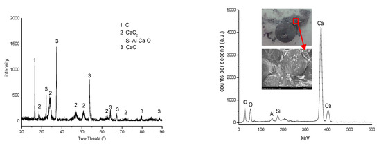 Figure 5 shows XRD and SEM+EDX results of the CaC2 layer (about 0.4 mm in thickness) formed between the closely contacted CaO and ash-C tablets at 1700 °C. It is clear that the sample contains CaC2 and CaO as well as trace amounts of Si and Al.