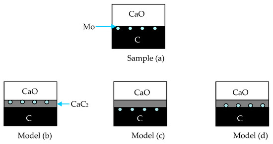 Diffusion models between CaO and ash–C distinguished by the Mo wires: (a) Sample a; (b) CaO diffuses into C; (c) C diffuses into CaO; (d) mutual diffusion of CaO and C.