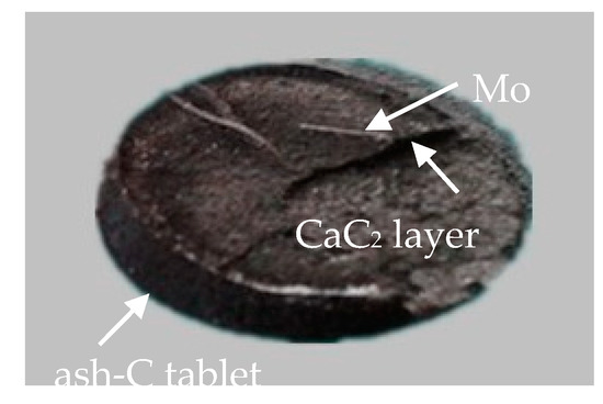 Figure 3 also shows that the ash-C tablets in close contact with the CaO tablet are very different from that heated alone, including the appearances of SiO2, Al2O3 and Ca2SiO4 at 1500 °C (spectrum (b), right) and SiC and CaC2 at 1700 °C (spectrum (c), right; note: a CaC2 layer is formed between the CaO and the ash-C tablets at 1700 °C). These phenomena indicate the diffusion of CaO to the ash-C tablets, which leads to a reaction of CaO with SiO2 at 1500 °C to form Ca2SiO4 [17] and a reaction of CaO with C at 1700 °C to form CaC2. The disappearance of Ca2SiO4 at 1700 °C may be attributed to its reaction with C that forms CaC2 and SiC [19].