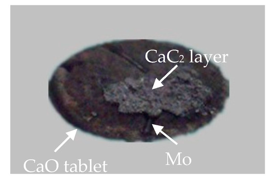 The graphite and CaO powders of 0.5 g were pressed separately at a pressure of 20 MPa into tablets in a die with an inner diameter of 13 mm, which yielded tablets with a thickness of 1.78 mm for CaO and 1.90 mm for the graphite. For the Kirkendall experiments, 0.5 g graphite or CaO was first pressed in the die at a pressure of 10 MPa, after laying the Mo wires on the upper surface of the sample it was pressed again at 20 MPa to yield a tablet with the Mo wires on one side of the surface.