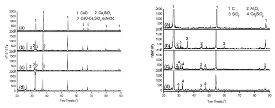XRD analysis of CaO (left) and ash-C (right) after being heat treated at 1500 °C for different time: (a) CaO or ash-C alone; (b) CaO+ash-C (1 h); (c) CaO+ash-C (2 h); (d) CaO+ash-C (4 h).
