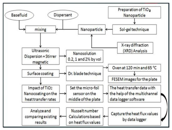 The usage of titanium dioxide (TiO2), due to its physical durability and excellent chemical properties, is popular in many applications such as heat transfer. Furthermore, the TiO2 particles are commercially available and cheap. A further goal of utilizing TiO2 nanoparticles was to be suspended in conventional fluids, commonly used in many types of heat exchangers, including circular tube [16,17], a double tube [18,19,20] and a shell and tube [21].
