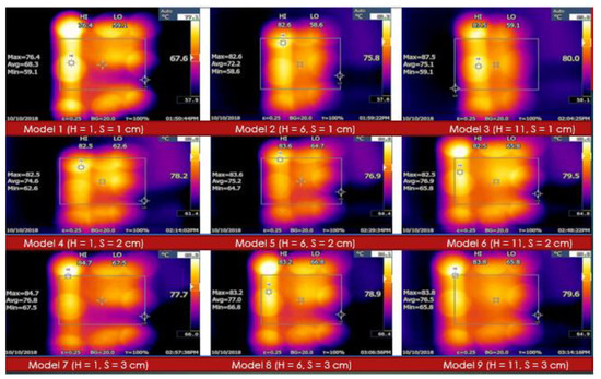 Infrared thermal imaging can be considered as a valuable tool. It allows visualization as well as improves the understanding regarding physical phenomena from thermal physics, mechanics, optics and radiation physics, and electromagnetism, both qualitatively and quantitatively [32]. As the hot aluminum plate is impinged by the twin jets, the plate starts cooling up and displays certain temperature distribution based on the jets’ characteristics and configuration. Figure 4 shows the temperature distribution occurring on the impingement plate, pertaining to the following cases (a, b, c, d, e, f, g, h, i, j). The temperature values are then labelled as max, min and average for the images. The steady jet cases presented below signify the nine models. For all models, nine pictures were captured, in which one picture was taken for each model at Re = 17,000. The first model yielded lower temperature of 59.1 °C and higher temperature of 67.4 °C, when S = 1 and H = 1. Few observations were quite distinct; on the twin jets, the temperature was distributed, which denotes the stagnation regions that were formed when both wall jets would clash together, signifying the impingement impact of hot twin circular jets. The steady jet case allowed achieving higher temperature rates due to high flow rates for the jets. When S = 1 cm and H = 1 cm, the first model yielded lower temperature of 55.2 °C and higher temperature of 95.6 °C. A good consistency was displayed by the analytic results, which pointed towards the established model’s rationality.