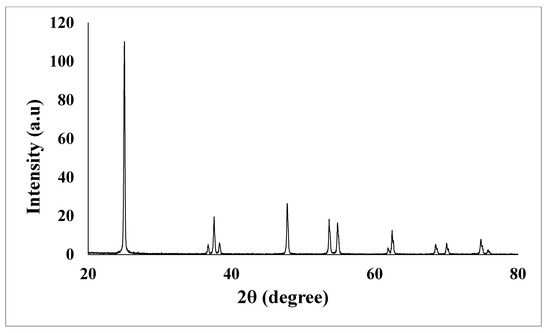 As per Figure 5, X-ray diffraction (XRD) analysis showcased the X-ray diffraction (XRD) patterns for the synthesized TiO2 sample based on the sol-gel method. At 2θ value, peaks could be seen at 25°, 37°, 38°, 47°, 54°, 55°, 62°, 69° and 75° with (JCPDS-01-075-2553), which verifies the anatase phase formation. Meanwhile, the peaks at various 2θ values verified crystallinity as well as high purity of the particles. with average crystalline size reach to 32.12 nm. Moreover, the unit cell parameter recorded as a (Å) = 3.8040, b (Å) = 3.8040, c (Å) = 9.6140, Alpha (º) = 90.0000, Beta (º) = 90.0000, and Gamma (º) = 90.0000, respectively.