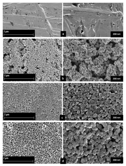 FESEM micrographs of the surface coated aluminum plate (a) uncoated; coated with TiO2 at (b) 0.1 M, (c) 0.5 M, and (d) 1.0 M.