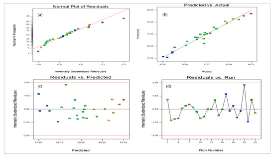 This section presents and talks about the results corresponding to the parametric study conducted based on the (DOE) technique. The design of the experiment was generated using the Design Expert software. The test was performed to determine the Nusselt numbers that correspond to the designed experiments that are given in Table 2. Based on these results, the quadratic model that the equation represented was suggested by the DOE technique. This section also presents the model adequacy checking results. Also, it states and discusses the correlation gathered from these experiments. To validate the correlation, it also reported a comparison with experimental results. This section also presents the optimum levels of the factors that gathered from model optimization. This was illustrated by a demonstration of response surface representation. Lastly, this section also discusses the interaction among factors at optimum conditions. The Nusselt number correlation with the factors being examined is given a full definition. It can then be well understood after completely examining the following details.