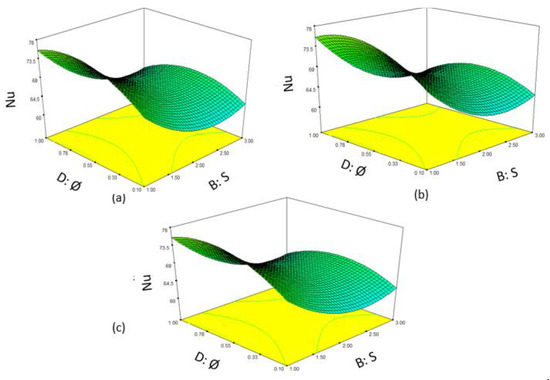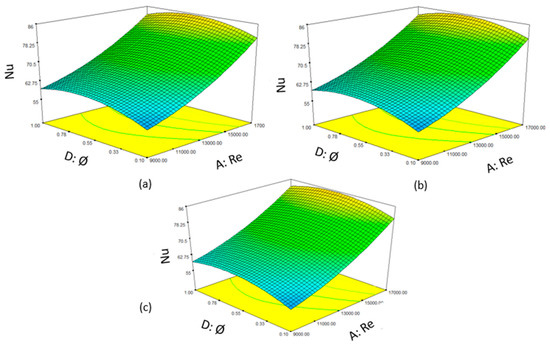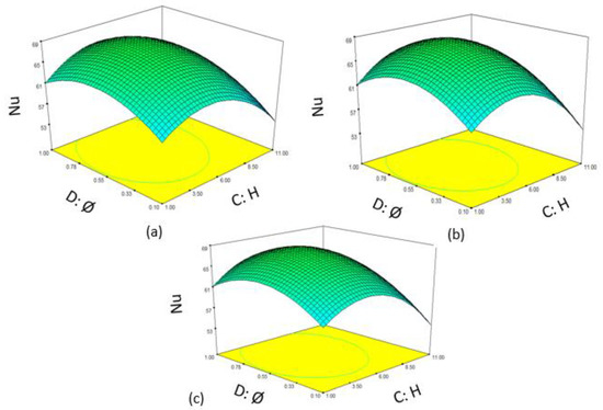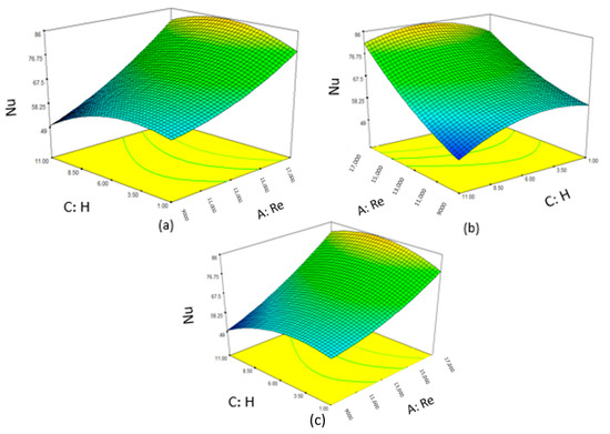 RSM is aimed at determining such polynomial coefficients that provide optimal response surface (y). The ‘x’s signify the coded variables that correspond to the actual parameters that are being considered. Here, , and denote the coded representation for Re, S, H and Ø parameters, respectively. ∆Re, ∆S, ∆H and ∆Ø indicate the differences of the considered parameters between the higher and lower values. Under RSM, various experimental designs can be classified based on their use for optimisation purpose. However, the most commonly applicable ones are face cantered cube design (FCD), central composite design (CCD) and D-optimal design [27]. In particular, CCD employs extra levels out for the specified range of factors that are under consideration in order to attain the property of rotatability [26]. In fact, physically, this condition cannot be applied for the case study because of the restriction of limited factor levels like in the case of Nano concentration, in which there is no level higher than its maximum limit, and less than its lower limit as a result of this factor’s periodic behaviour. On the other hand, few of the factors offer more flexibility in terms of modifying their levels but continue to face physical constraint of the experimental setup, which makes the FCD’s cuboidal region feature unsuitable for the case under investigation [26]. Moreover, this work specifies that 50 run each is generated by FCD and CCD generate, while the goal of the current experimental work was achieved by D-optimal algorithm in just 28 runs. The attractive feature of D-optimal is that it increases the accuracy of the estimated polynomial coefficients (β’s), while the maximum variance is minimized as a result of maximization of the determinant for matrix in which is the design matrix by [27]. Consequently, the adoption of D-optimal design is done to configure an optimum relation between the influential parameters and the response since it is considered as a preferable selection for approximating the surface response by [28].