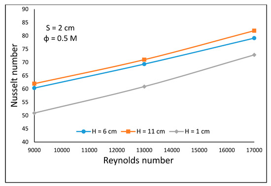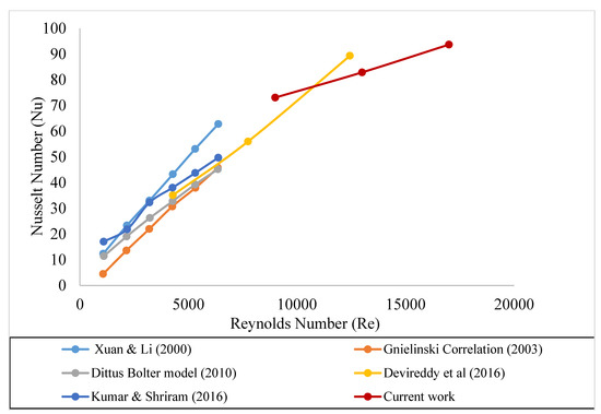 There is a significant improvement in the result of Nusselt number as against other results such as [29,66,67,68,69]. There was a consistency in the results for the heat transfer rate for the surface coated by TiO2 solution in the most cases compared to other results like [68,70,71] as shown in Figure 23.