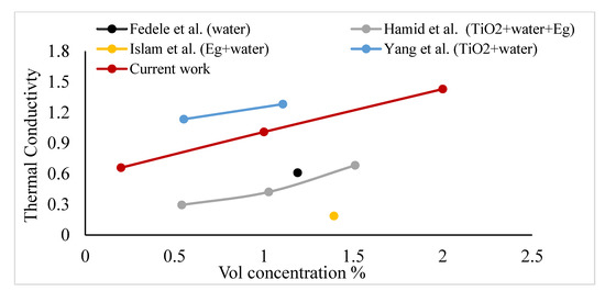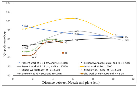 The interaction of Nusselt number values and Reynolds number for different research work is showed in Figure 20, it’s also illustrated the current work values is higher than others [53,54,55,56]. Interaction of the thermal conductivity with nanofluid concentration has been illustrated in Figure 21 comparing with many researchers to validate the current research work [57,58,59,60]. Figure 22 presents the interaction of Nusselt number values with different concentrations of nanofluid, the figure shows that the current work is higher than Arjun work in both laminar and turbulent velocity flow [61]. Based on the results of the flow characteristics, one can obtain higher turbulence intensity at a higher velocity. Also, based on the previously presented results of the parametric study, a Reynolds number equal to around 17,000 is considered the optimum value for obtaining the highest Nusselt number. Therefore, that Reynolds number was used to obtain the current results and examine the higher heat transfer enhancement levels. The outcomes of the heat transfer enhancement test are discussed from different viewpoints. Firstly, this section has been discussed the study of the impact of the twin impingement jet on the Nusselt number obtained through these experiments. Furthermore, this section has presented a discussion of the effect of a nanosolution coating on the Nusselt number enhancement factor. There is also an explanation regarding the influence of jet configurations on the heat flux enhancement factor. All these areas support the creation of a clear view regarding the assessment of heat transfer enhancement as a result of twin impinging jets. The Nusselt number’s behavior is considered based on the normalized nozzle-plate distance and changes from one to eleven for twin jets. The figures above present the Nusselt number determined at the interference zone centerline of twin jets and for the various cases. The nanoparticle concentrations have taken into account three levels of concentration (0.1 M, 0.5 M, and 1 M) and three values for the Reynolds number (9000, 13,000 and 17,000). It was evident that the concentration (especially at 0.5 M) was almost successful in achieving a Nusselt number that is higher compared to the others. However, at H = 1 cm, it was observed that the steady jet had better performance compared to others at S = 1 cm. Therefore, the two wall jets produced by the impinging of twin jets on the hot plate served as the only cooling air source at secondary stagnation point found between the twin jets. Hence, from the main stagnation point, the heat removing action significantly affects the removal of heat from the secondary stagnation point. Since it was proven by previous studies that steady single jet are better at generating heat transfer than the pulsating jet at stagnation point [62], it can also be said that the heat removing action of the steady jets from the secondary stagnation point is better than pulsating jets for that given case. Velocity increment takes place at the centerline of the interference zone, which increases the velocity and results into heat transfer and Nusselt number augmentation [63,64,65].
