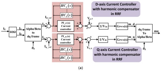 However, as mentioned earlier, the current injected into the grid gets polluted due to the harmonics present in the grid voltage, along with the other detrimental factors. Unfortunately, under these conditions, the RRF fundamental current controller is not able to remove the low order harmonics. This makes it difficult to achieve the THD of the GCI output current suggested by the harmonic standards. To eliminate the low-order harmonics from the GCI output current, two common methods for harmonic compensation have been proposed in RRF [21,22,23,24,25,26,27,28,29,30,31].