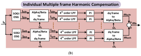The second conventional method is to compensate the harmonic on its individual multiple frame as shown in Figure 1b. In this method, an individual harmonic is detected at its own frequency frame and compensated after it is converted to a DC component [29,30,31]. This method has several advantages over the first approach due to the fact that it is: (1) independent of the frequency; (2) simple to design the harmonic compensator (PI controller); and (3) simple to implement and tune the parameters. However, this method has several disadvantages, such as: