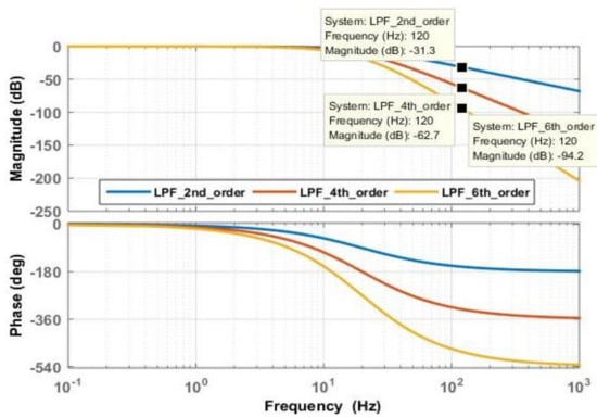 The next step is to select the gain slope of the filter at the stop band. Table 1 shows the attenuation of the filter with different slopes at the stop band. In designing the filter, the selection of the gain slope at the stop band is a trade-off between the attenuation and the dynamics of the system. Figure 4 shows the bode plots of the LPFs with different orders. Here, we have selected a 4th order Butterworth filter with a slope of −80 dB/dec, since it provides an attenuation of 1/1000 (−60 dB) at 120 Hz. An even higher attenuation will increase the computational burden and lead to the slow dynamics of the system.