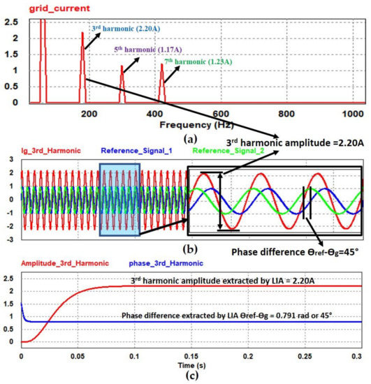 Figure 5 shows the PSIM simulation results to extract the amplitude and the phase information of a certain frequency component using the reference signals generated arbitrarily. Figure 5a shows the FFT of the grid current, which contains multiple odd harmonics (3rd, 5th and 7th). Here, the grid current is multiplied with a reference signal at the 3rd harmonic frequency. Figure 5b shows the 3rd harmonic of the grid current and the reference signal generated arbitrarily, which is independent of the grid theta. Figure 5c shows the amplitude and phase information of the 3rd harmonic shifted to zero frequency and the other AC ripples are removed by the LPF. Thus, from Figure 5c we can see that the amplitude and phase of the harmonic at the reference frequency can be obtained with high accuracy due to the outstanding performance of the LIA.