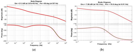 The design of the fundamental current controller Gi(s) significantly affects the bandwidth and stability margin of the whole system. Ideally, the bandwidth of a closed loop system must be maximized by selecting a higher proportional gain kp to obtain a fast-dynamic response and good disturbance rejection capability. However, a high gain degrades the stability and the noise immunity of the control system. Consequently, the choice of the proportional gain kp is a trade-off between the stability margin and the bandwidth of the system. The PI current controller is designed to achieve a wider bandwidth and a higher phase and gain margins by using the SISOTOOL in MATLAB software (R2015a, MathWorks, USA). The open loop gain bode plot of the current controller is shown in Figure 7a. The parameters kp and ki are chosen to be 5.055 and 96.06, respectively.