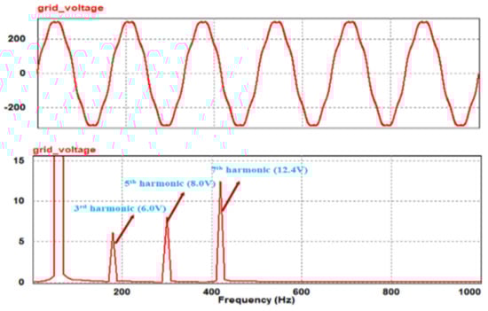 To show the superior performance of the proposed method with respect to the conventional methods, PSIM simulations with a 5 kW single phase inverter are conducted under a highly distorted grid voltage condition (THD of the grid voltage is around 5.0%). The amplitude of the 3rd, 5th, and 7th grid harmonics are 1.9%, 2.5%, and 4.0% of the fundamental components, respectively as shown in Figure 8. The unipolar SPWM scheme is used along with 1.0µs dead time given to drive the IGBT. All the system parameters are listed in Table 2.