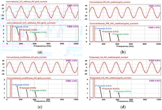 The performance of the conventional and proposed harmonic compensation methods are presented in Figure 9 along with the FFT results. It can be seen in Figure 9a that the grid current shows higher THD, i.e., 12% with no harmonic compensation and the 3rd, 5th, and 7th harmonics currents are 3.2 A, 1.54 A, and 1.34 A, respectively. Figure 9b shows that the THD of the grid current is reduced from 12% to 2.9% with a reduction of 75% by the conventional PR-based harmonic compensation and 3rd, 5th, and 7th harmonics are 0.41 A, 0.53 A, and 0.64 A, respectively. Figure 9c shows that THD of the grid current is reduced from 12% to 1.6% with a reduction of 87% by the conventional individual multiple frames-based harmonic compensation and 3rd, 5th and 7th harmonics are 0.23 A, 0.25 A, and 0.35 A, respectively. In Figure 9d, the grid current THD is reduced from 12% to 0.8% with a reduction of 93% by the proposed LIA-based harmonic compensation, and 3rd, 5th, and 7th harmonics are 0.02 A, 0.015 A, and 0.013 A, respectively.
