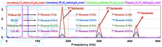 In Figure 10, the grid current FFT results are compared after employing different harmonic compensations. It can be observed from the simulation results that the harmonic reduction with the proposed LIA method shows an outstanding performance in eliminating the current harmonics as compared to those of other techniques.