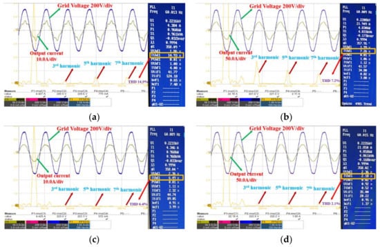 Figure 13a,b shows the experimental results of the RRF current controller without a harmonic compensator at 1 kW and 5 kW, respectively. It can be observed from Figure 13a that the 3rd, 5th, and 7th harmonics are 0.25 A, 0.53 A, and 0.58 A, respectively, and that the THD of the output current is 14.9%. In Figure 13b, the magnitude of the 3rd, 5th, and 7th harmonics are 1.75 A, 1.1 A, and 0.8 A, respectively, and the THD of the output current is 7.2%, which exceeds the values suggested by IEEE Std.519 and P1547.