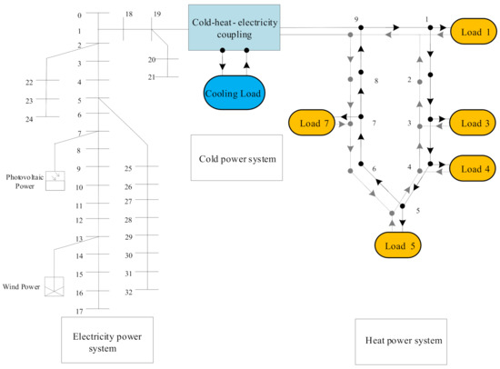 The topology of the distributed energy system proposed is shown in Figure 1, which is mainly composed of the following four parts: IEEE power system of 33 nodes [25], double loop thermodynamic system, and cold–heat–electricity coupling link of 9-node ring network. For the current is not complete and unified cold energy transmission system, so the cold will force the system output force load directly connected to cold–heat–electricity coupling links to ensure that the distributed energy system can supply the cold.