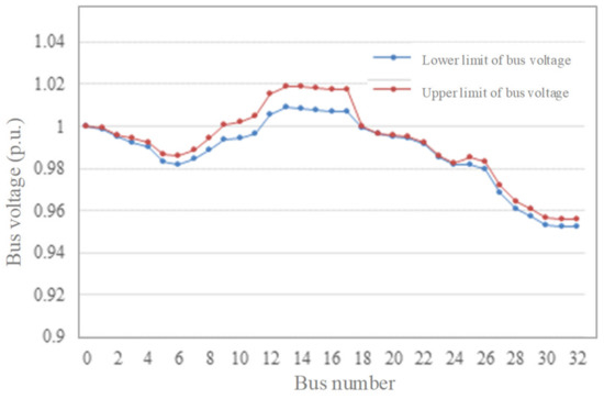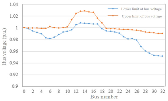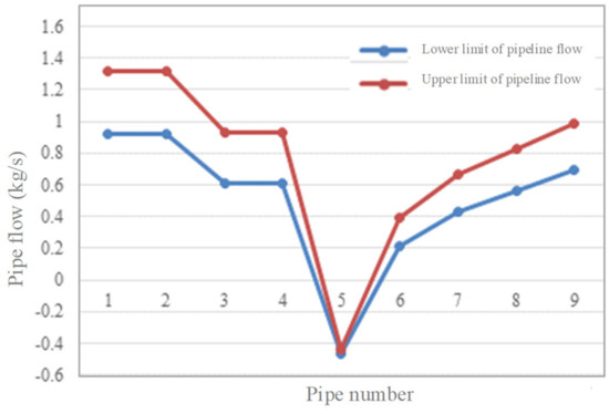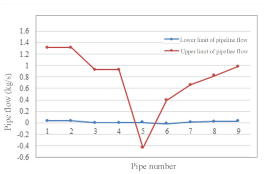 Figure 3 and Figure 4 show that the upper and lower limits of bus voltage in the power subsystem and the upper and lower limits of pipeline flow in the thermal subsystem can be calculated respectively by affine algorithm. Figure 3 shows that when the load of system changes over a smaller interval, the voltage variation range of nodes (node 1–3 and node 18–21) in the power system close to the coupling link is small, less than 1%, shows that when the load demand was great, the system voltage is weak, and the system have the risk of voltage collapse. Therefore, in the near several nodes, additional generators may be considered to improve the voltage stability of the system. It can be seen from Figure 4 that, under the low load, the flow rate at the end node 5 flows in the opposite direction, with a small and low flow rate, which also means that the demand for pipeline radius is small. As node 1 and node 2 are close to the coupling link, where is a large demand for regulation and pipeline flow, so a larger pipeline is needed to support the operation of the thermal system.
