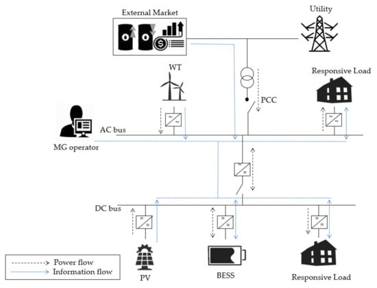 In order to provide the reliability of power to load, our work focuses on the grid-connected mode with the assumption that the utility is a power supplier. Figure 1 shows the structure of the proposed MG model consisting of PV, WT, BESS, and responsive loads. The DC/AC inverter is a component of the system because intermittent RE sources cause high-level fluctuations and disturbances in the system []. For the primary use of the RE, the MGO decides whether to receive electrical power from the utility. The electricity prices are also communicated to users regarding each time slot and BESS aids in reducing the load by storing surplus power and using it during peak demand times.