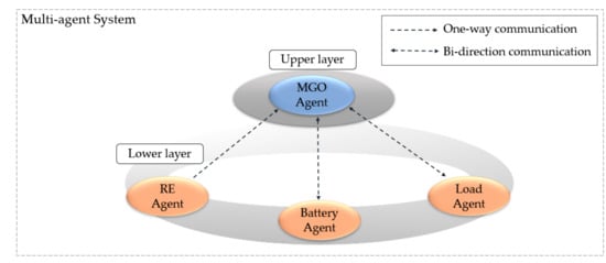 The MAS is composed of numerous distributed intelligent agents that communicate and cooperate within the environment for each agent in order to solve the multifaceted optimization problems. The MAS characteristics can be summarized as capable of dealing with complex and large problems, extendibility and flexibility, intelligence and autonomy, handling distributed data and expertise, and modularity and cooperation [,,]. For the MAS model to work effectively, the organization of the communication among agents and operation is important. Hierarchical systems need to optimize different types of energy management systems. The smart grid architecture model has been used as a typical power management system consisting of the hierarchical layers for implementing information exchange and technical functions. In order to communicate between each agent in MAS, addressing communication networks or links is also a huge research area. In this regard, we assumed that the communication is based on basic Ethernet communication, and the database is the blackboard [].