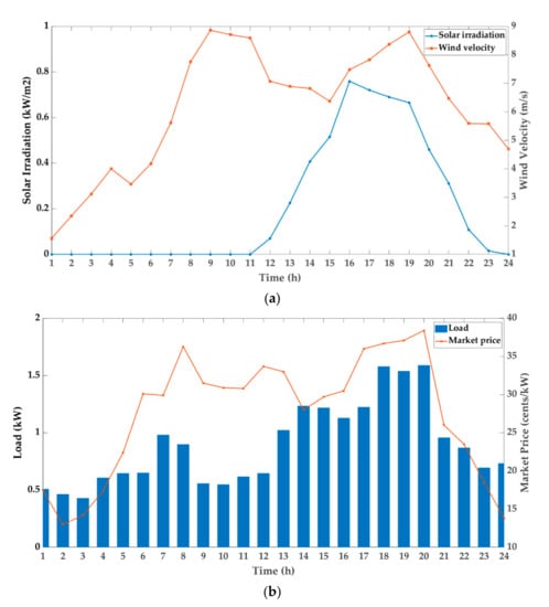 Input data over a 24 h horizon. (a) Wind velocity and solar irradiation. (b) Power load and market price.
