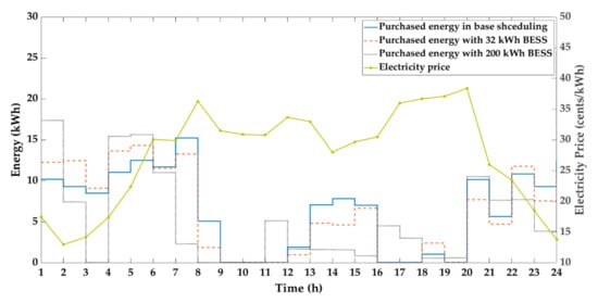 Figure 5 illustrates the amount of energy purchased without the BESS and with 32 kWh and 200 kWh BESS. Comparing the amounts of power purchased from 8 to 20 h when the electricity price is high, note that purchased energy is lower using BESS. In particular, the 200 kWh BESS significantly curtails the MG operating cost by reducing the amount of purchased power at 8 h and from 13 to 16 h, when the electricity price is high.