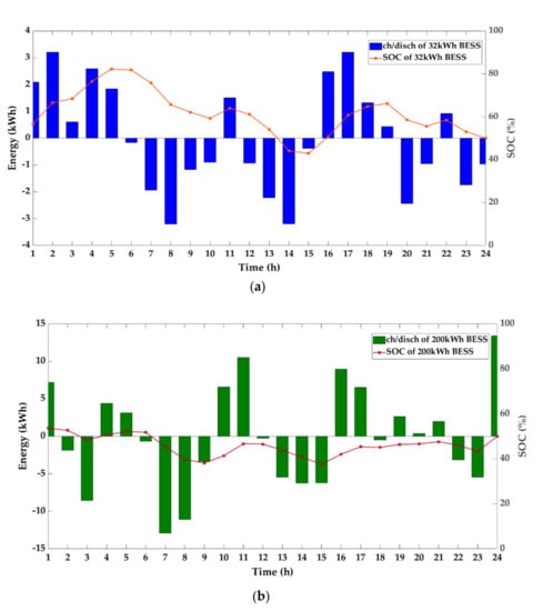 Optimal charging/discharging cycles and state of charge (SOC) of BESS. (a) 32 kWh BESS. (b) 200 kWh BESS.