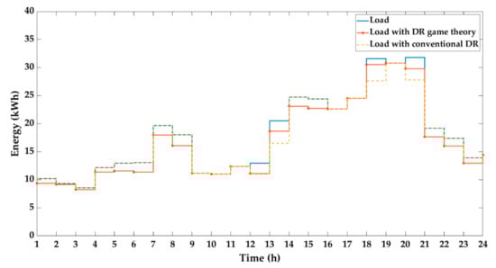 Figure 7 illustrates the power load profiles with and without the DR program. The DR game strategy intends to reduce power regardless of the peak energy time. If there is an RE that can satisfy the power load, the incentive value is fixed at 0 to preclude the game theory from being established. The conventional DR can only participate for up to 4 h a day, thus, it should reduce energy when the power market prices are high.