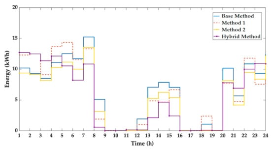 Figure 9 illustrates the purchased energy from the utility, which is associated with the MG operating costs. BESS shifts the required energy in Method 1, and DR curtails the power load in Method 2. The hybrid method requires the least amount of energy from 5 to 18 h, indicating the impact of BESS and DR. In the proposed optimal operation, the purchased energy capacity during the high-cost period has the largest reduction. Consequently, it is clear that the hybrid method applies the most economical decision among agents and also reduces the MG utilization cost.