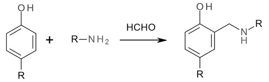 Mannich reactions consist of the condensation of three substrates: an aldehyde (usually formaldehyde), a first- or second-order amine, and a compound containing active hydrogen, e.g., a nitrile, an aliphatic nitro compound, or a phenol. The final result of the condensation is a Mannich base [38,39,40] (Figure 1).