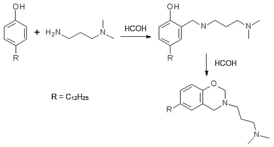 3-(dimethylamino)-1-propylamine (99%) and 4-dodecylphenol mixture of isomers (98.5%) were purchased from Sigma–Aldrich Co. (St. Louis, MO, USA), xylene mixture of isomers pure (>98.5%) and formaldehyde 36–38% solution were purchased from Chempur (Piekary Śląskie, Poland), ethanol pure (>96%) was obtained from Alpinus Chemia Ltd. (Solec Kujawski, Poland) and methanol pure (>99.8%) from Avantor Performance Materials Poland Inc. (Gliwice, Poland) was used. All these chemicals were used without any further treatment.