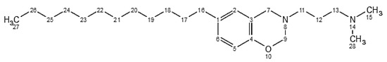 Structure of 6-dodecyl-3-(N,N-dimethylaminopropyl)-3,4-dihydro-2H-[1,3]-benzoxazine with numbered carbon atoms.