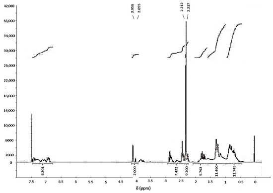 Moreover, two distinct singlets at approximately 2.3 were present, originating from protons of the CH3 groups (C14, C28) connected to the nitrogen atom. The remaining signals were located in the range of 2.0–3.0 ppm and may be attributed to protons connected to carbon atoms in the remaining methylene groups connected with nitrogen atoms (C11 and C13), and to the methylene group of the aliphatic chain in the α position in relation to the ring (Figure 6).