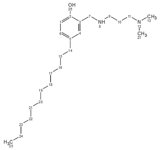 Structure of 2-(((3-dimethylaminopropyl)amino)methyl)-4-dodecylphenol with numbered carbon atoms.