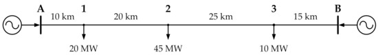 The degree of branch utilization, defined by Equation (3), will be determined for a simple two-sided supplied network. Figure 1 shows the diagram of this network. It also shows the lengths of lines and the active power consumed in load buses (reactive power consumption is omitted). All lines were assumed to have the same impedance parameters per kilometer.
