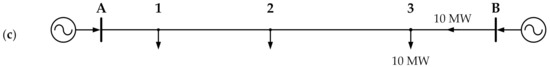 The incremental power flow method is based on the superposition principle. This principle states that, for linear electrical circuits, the resultant response caused by two or more stimuli is the sum of the responses that would have been caused by each stimulus individually. Thus, the natural power flow in the analyzed two-sided supplied network (Figure 2), resulting from the power consumed by all consumers, is the sum of three component flows, calculated using Formula (4) for each consumer separately, with zero powers consumed in other buses. Figure 5 shows these power flows.