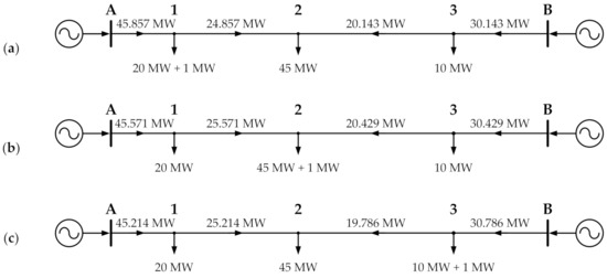 Natural active power flow after increasing the demand by 1 MW in bus: (a) 1; (b) 2; (c) 3.