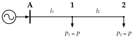 The indicated difference between the TF and TFL coefficients can be well-illustrated using the example of a radial network. The network supplies two customers connected as shown in Figure 7. Both customers consume the same power P1 = P2 = P.