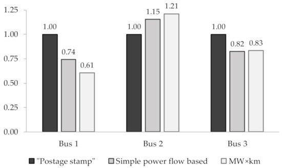 The relative rates of transmission charges calculated using the “postage stamp” method are the same for all consumers. This means that each consumer participates equally in covering the total fixed costs of transmission, regardless of their degree of network utilization. On the other hand, in the case of the power flow based methods, differentiation of rates is noticeable. The consumer connected to bus 1 has the lowest rate. This customer receives power mainly through the line A-1 (Figure 5a), which is also the shortest line in the entire network. Thus, this consumer covers primarily the costs of the line A-1 and covers the cost of the other lines to a much lesser extent. A similar situation takes place in the case of the consumer connected to bus 3. This customer receives power mainly through the line 3-B (Figure 5c). However, the ratio of the power flowing through this line to the power flowing to this consumer from the opposite source is smaller than in the case of the first consumer, which results in a relatively higher degree of network utilization, which in turn results in a higher rate of transmission charge. The consumer connected to node 2 has the highest rate. This customer receives power from both sources in a similar proportion (Figure 5b), and therefore this consumer has the highest network utilization, which is reflected in the value of their rate.