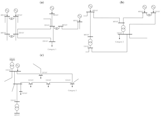 Example supply method of the industrial customers belonging to the different categories. (a) category 1–consumer connected to the 220 kV network node, (b) category 2–consumer connected to the strong 110 kV network node, (c) category 3–consumer connected to the node located deep inside the 110 kV network.