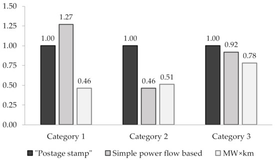 Figure 10 shows the relative rates of transmission charges for industrial customers for the three different categories. As has already been pointed out, both power flow based methods analyzed in this article give different results for the allocation of fixed costs. For some customers, such as consumers of category 1, these differences can be significant. Considering the previously discussed features of these methods, the MW·km method is recommended.
