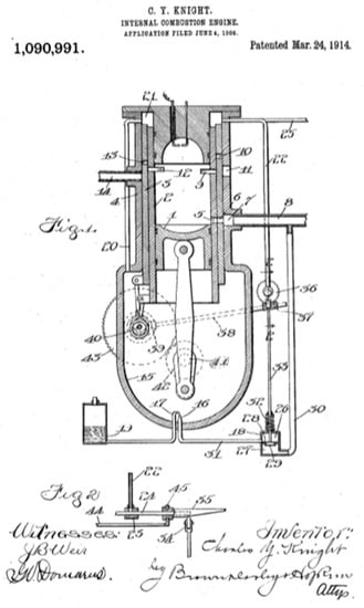 C.Y. Knight patent for internal combustion engine US patent 1090991 filed 4 June 1906. Reproduced with permission from US Patent Office. Copyright Publisher, 1914.