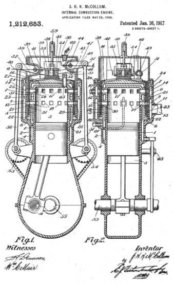 James McCollum, 29 May 1909, internal combustion engine, Patent US 1212653. Reproduced with permission from US patent office Copyright Publisher, 1917.