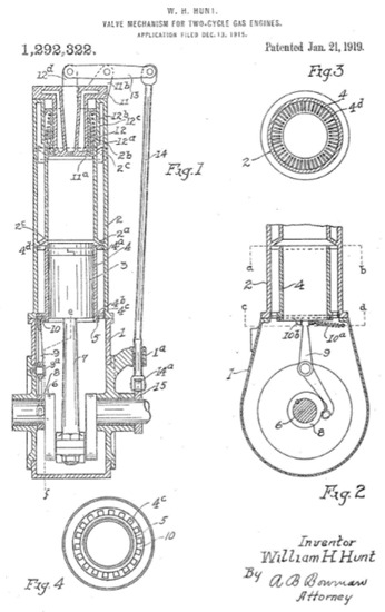 W.H. Hunt 13 December 1915, valve mechanism for two-stroke gas engine US 1292322. Reproduced with permission from US Patent. Copyright Publisher, 1919.
