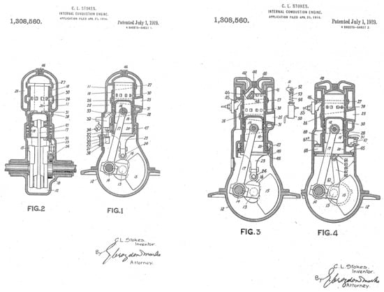 C.L Stokes, 2 April 1916, internal combustion engine US 1308560. Reproduced with permission from US Patent Office. Copyright Publisher, 1919.